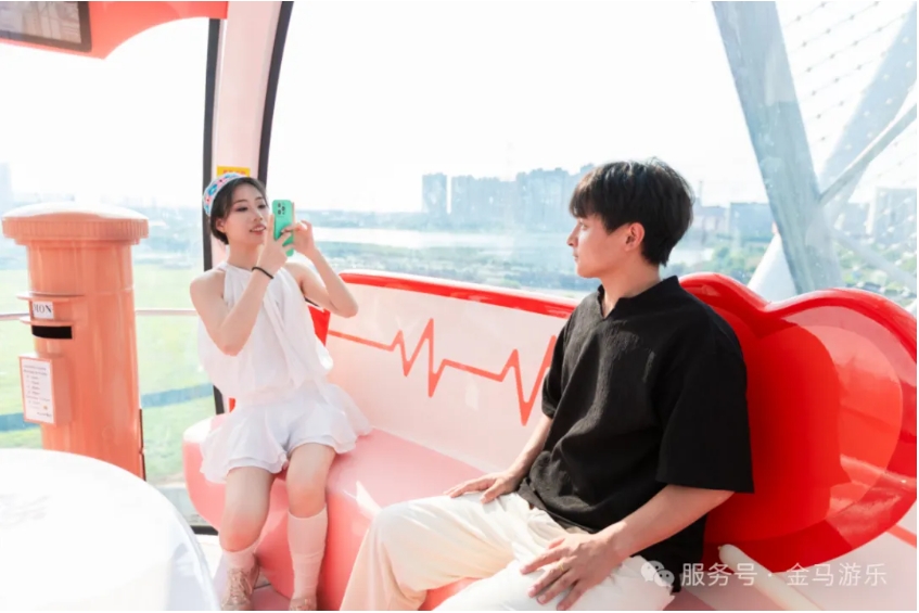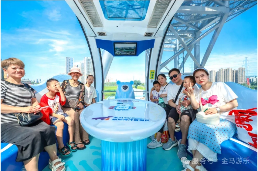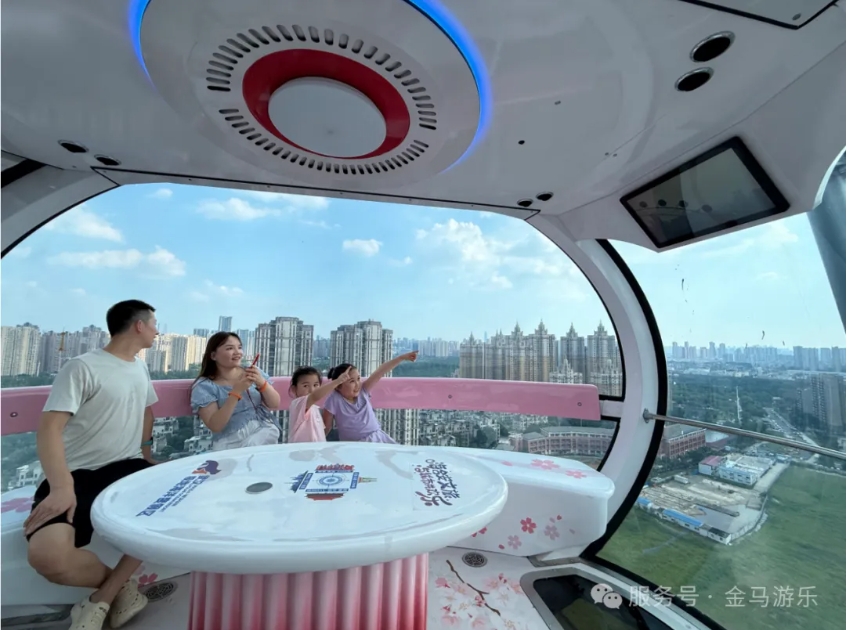 轉(zhuǎn)輪配備36個(gè)面積國內(nèi)領(lǐng)先的的橢圓形全景“太空艙”轎廂,單艙面積約6平方米,可容納8-10人,滿載可乘坐352人。艙內(nèi)設(shè)有環(huán)形座椅及中央活動(dòng)區(qū),滿足全家同乘的寬敞舒適需求。獨(dú)特的吊掛式橢圓轎廂搭配360°全透明玻璃幕墻,營造無死角全景視野,游客可盡覽景區(qū)及壯闊長江風(fēng)光,仿佛置身云端,感受城市脈動(dòng)。艙內(nèi)更融合技術(shù)創(chuàng)新與美學(xué)設(shè)計(jì),打造了涵蓋極地、愛情、童趣等多種風(fēng)格的主題艙,以及驚險(xiǎn)刺激的底部透明艙,支持婚禮、慶生、商務(wù)派對等主題定制活動(dòng)。此外,艙內(nèi)還配備電子屏實(shí)時(shí)拍照、燈光氛圍調(diào)節(jié)等功能,滿足多元化場景需求。通過以上創(chuàng)新設(shè)計(jì),成功將“楚天之眼”從傳統(tǒng)的觀景設(shè)施升級為多功能社交空間,塑造了武漢文旅新地標(biāo)。
