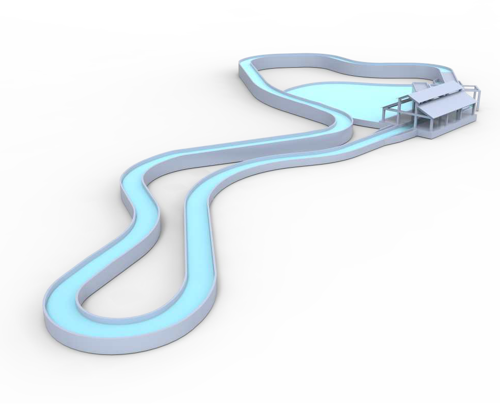 峽谷漂流,筏體經(jīng)提升系統(tǒng)由站臺(tái)提升至水道的高位后,由主泵推動(dòng)的流水驅(qū)動(dòng)前進(jìn)。船速由水道形狀決定,通過水底阻水堰的定位設(shè)置來制造洶涌的水波,沿途可對水道兩旁進(jìn)行景觀包裝來制造融入自然的環(huán)境,讓游玩體驗(yàn)更親近大自然。
