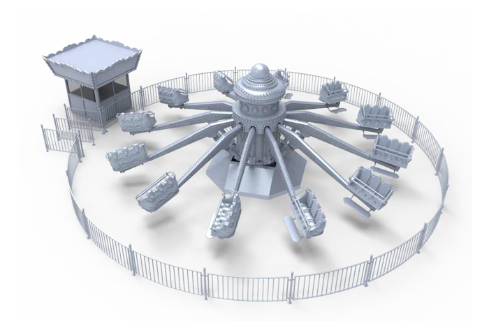 彈跳機中軸為中心帶動周圍十二個座艙繞豎直中軸旋轉(zhuǎn),同時座艙伴隨著音樂進行高低、快慢不同的跳躍式運動。使乘客在游玩過程中體驗到旋轉(zhuǎn)加跳躍的樂趣。