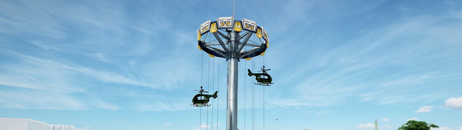 以中國?助研制直-5直升機為設計靈感,模仿直升機運??式制作的?款游樂設備。直升機的座艙外形,配備軍裝迷彩的配?;打破傳統(tǒng)新穎的背靠背的乘坐?式,觀景視野更開闊。運?時,乘客猶如在直升機中,時?升?頂端,時?上下起伏,頂上和尾翼的旋翼會隨上升下降?配合轉動。