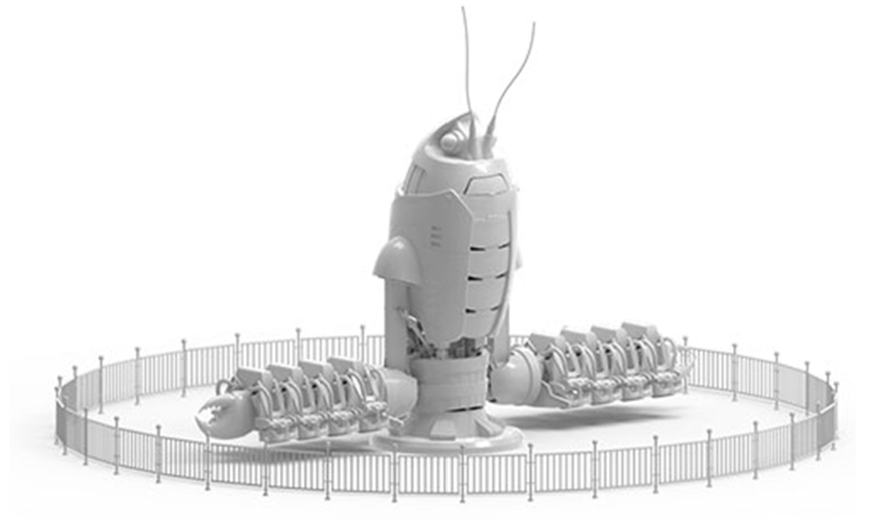 JQJ-16A巨鉗戰(zhàn)甲,設(shè)備結(jié)構(gòu)較新穎,體驗感驚險刺激。開始運?時設(shè)備主體先上升,上升到?定?度后,進?公轉(zhuǎn)并伴隨著座艙的?轉(zhuǎn)和升降臂的升降。整體包裝設(shè)計采?機械?蝦造型,標(biāo)志性的?蝦紅配?加上煙霧、燈光的效果,帶給游客歡樂、刺激的體驗。